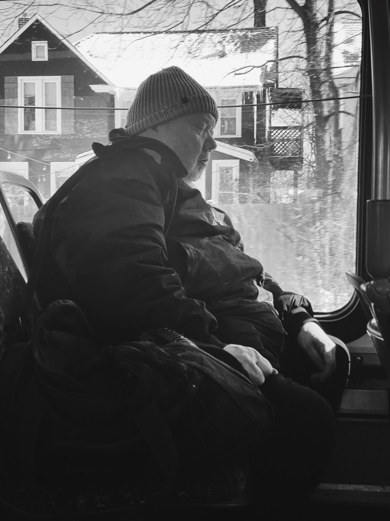 And it’s been eye-opening. I’ve been seeing more of the rough edges—the quiet weight of homelessness, the daily grind in winter coats and tired eyes. The cold doesn’t hide anything. It just makes it sharper. Riding the bus let me witness the city from inside out, not as a passerby, but as a part of it.